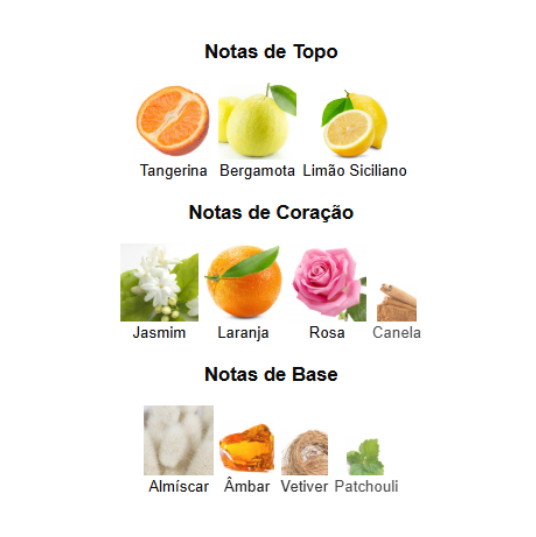 ✔️ Contraste Perfeito: A união da Canela quente com o frescor cítrico e os florais torna o perfume complexo e interessante.