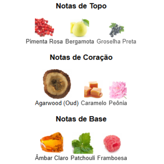 Notas de Fundo (O Rastro Sedutor): A base se assenta em uma trilha rica e duradoura. O Âmbar Claro confere calor suave, o Patchouli adiciona uma profundidade terrosa, e a Framboesa encerra com um toque de doçura frutada inesperada, tornando a experiência irresistível.